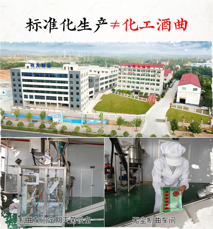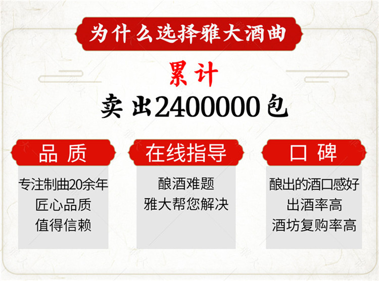 采用微生物发酵技术结合传统中草药酒曲工艺而生产出的生物型中草药高产酒曲。采用微生物菌种加中草药成分配制而成,发酵力是传统酒曲的2倍,耐高低温,稳定性好,让做酒达到夏不酸酒,冬不坏醅。纯中草药做引,提升酒的香味和口感,口感醇厚,喝了口不干,舌不燥,头不痛!出酒率高,颗粒小,无需加水活化,可直接使用。